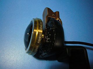 MicrosoftHD-3000は、前飾りが邪魔だったのでそれを剥ぎ取ったら、魚眼レンズを、直接留める方法が無くなったので、レンズ・クリップをそのまま使って留めることにした。