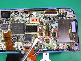 これは、“左ボタン利かず”という不具合があるものだったのですが、幸い、ボタンの半田付け部を再熔融しただけで、直った!