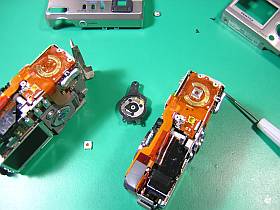 前後のカバーやシャッタの上部構造を外して、問題SWの半田付け4箇所を外して、手持ち機のSWと交換。 これで、ちゃんと撮影出来るようになりました。