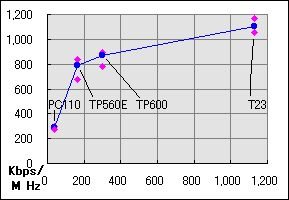 しかし、PCの能力に抑えられている可能性もあったので、今般1.13GHzのThinkPad T23を購入したのを期に、これを加えて測ってみる事にしました。