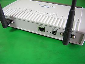 このAPは、11a(54Mbps,5.2GHz)と11b(11Mbps,2.4GHz)の両方に対応、また、それぞれ独立に条件設定が出来て、なかなか具合が良さそうなのですが、残念ながら有線LANポートが1口しか無い。(左写真)