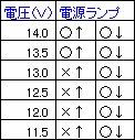 その後、エンジンを止めても点灯していました。どうやら、Lib60の電源回路には、ヒステリシス特性があるようです。(標準内蔵バッテリを外して別電源で測った時のランプの消灯・点灯状況は、右表。)