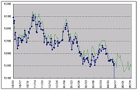 で、予測カーブは至って平穏!(?)・・・ しかし、左図下が、実際の値の変化(緑線)で、この後、上方へ一旦上がるピークが出来ていたのだ。(茶色の四角の範囲)