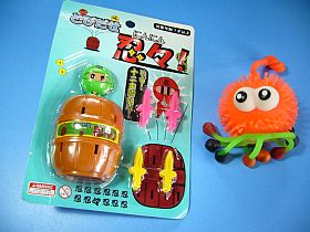 左側のは、“海賊黒ひげ?”の模造品、「とびだせ忍々!」だそうでして、やってみたら、勢いよく飛び出して天井まで突進!で、頭をぶっつけ、気絶して、落っこちて来た?(左上写真<クリック>)