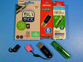 左側から、TATCHT01 4GB(\580税込み)、PFU-MH/4Pピンク 4GB(\500税込み)、RUF2WB8GBK黒 8GB(\780税込み)、RUF3-C4GGR黒(高速型) (\1,281税込み)