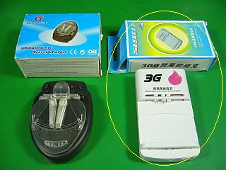 仮宿で使っていた「ジャンクの簡易型充電器」の調子が悪くなって、充電が出来なくなって来たので、次のものを物色していたのですが、思い切って、ネット・オークションで最安値だった「3G(商務萬能座充)とかいうのを買ってみました。(左写真右側 \800送料込み)