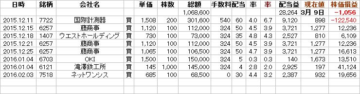 これで、(2月末現在で)約5万円近くになっていた手持ち株の原価損(昨年末の実情)は、マイナス約千円にまで圧縮出来た。