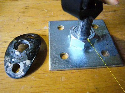 支え棒/シャフトがきちきち入るくらいまで削って、それを金槌で叩き込んだ。(図1)