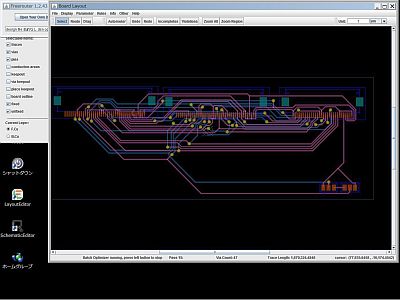 実は、両端が開放端で、途中には部品が置かれていない、“配線だけのレイアウト”で、果たして“自動配線”が上手く出来るのか?と疑っていたのだが、走らせて見たら、(ルール違反などもせずに)結構“一生懸命”にやってくれるようで、気に入った!(図1、図2<クリック>)