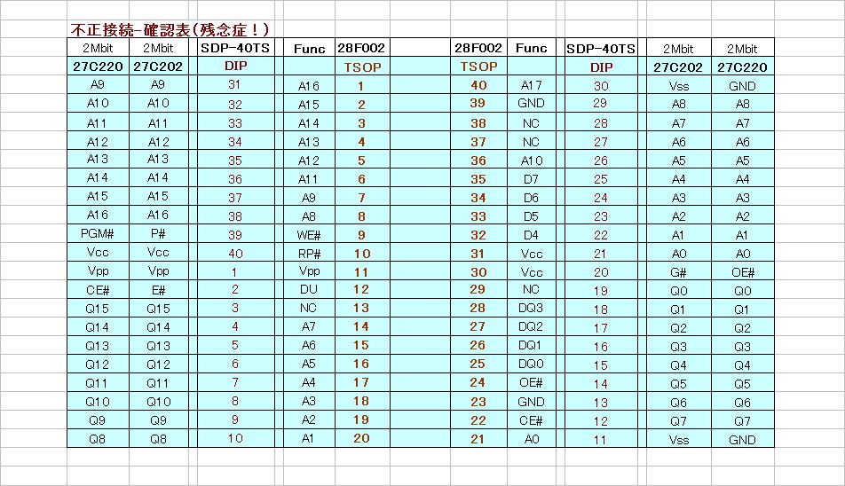「PROMライタ」で対応出来るPROM種(27C202、27C220)から、その端子配置を探し出して来て、表にしてみたら、トンでもない配置になっていた!(誤接続表!)