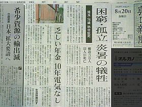 以前なら、三面記事にしかならなかった内容を、第一面に持って来ているが...そうすれば、“読者に受ける”と思っているのかなぁ。(他に、軟らかいネタ、つまり、咀嚼・消化し易いものばかり食べさせて歯や顎を弱くする記事?!..が無い?)