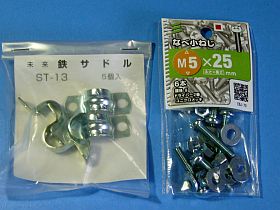機械的保持方式」でやることにして、ホームセンターで買って来たのは、13mm径の「鉄サドル」と5mmφの「ビス・ナット一式」(左写真、費用\180税込)