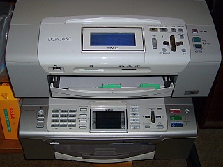 ここ2ヶ月ほど、(インクジェット・)プリンタDCP-385C(図1の上側)を使っていなかったら、縦筋が一杯で、まともなカラー写真がプリント出来なくなってしまった。orz