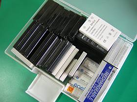(見境も無く!)色々なデジカメを修復していると、その機種数だけ、異なるバッテリが必要になります。(左写真)