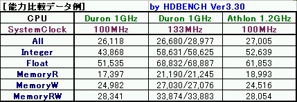 数値にそれほど大きな差は無いようですが、Duron 133MHzがやや優勢のようでした。特に整数・浮動少数演算では数値が少し大きいので、今の場合有利かも。