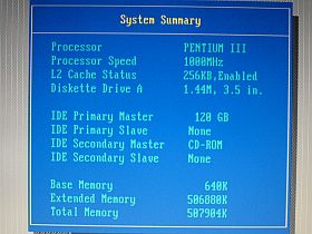 (マザーボードをType 2179用に替えた)Aptiva(2134)のCPUをPentiumIII 1GHz(\980税込)に、またHDDをSeagate 120GB(\1,000税込)、メモリを512MB(手持256MBx2)にして、性能アップを図りました。