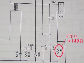 改造案として、他の箇所を弄るより、電流制限抵抗の値を下げるのが手っ取り早いと考えたのですが、現物を見たら270Ωが付いていました。他方、この資料_MP1010B_での推奨値は140Ω。