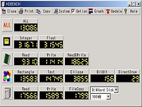 大体の感触を見るために、HDBENCHを走らせたら、左図のようでした。_これは一例。やる度に、値は多少違って来ます_