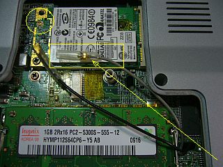 その後、「メモリ」1GBを装着してから、手近かにあった「無線LANカード」を乗せて見たのですが、可笑しい! ・・・ フィーダ線の長さが足りませぬ!えー?_左写真_