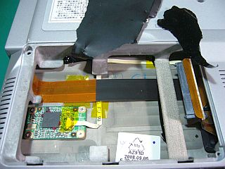 やっと、剥がしたキーボード下の様子を見たら、フィーダ線は分かりましたが、固定されている箇所があって、簡単に伸ばせるかどうか分からず。_左上写真<クリック>_