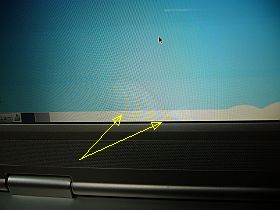 そこで、CD版Puppy Linuxを走らせると、ちゃんと画面は出た!までは良かったのですが、何やら画面下側に大きなシミが2山見えました。ギョギョ!_左写真、矢印の先、2箇所_