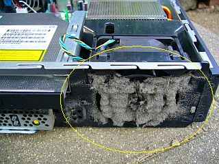 ファンに引き寄せられてくっ付いている埃は、楽々と取れるのだが、冷却ファンの羽根にこびり付いた汚れは、かなり丁寧に擦り落とさないと取れないから厄介だ。_左写真<クリック>_