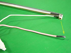 で、早速表示部を開けて、液晶モジュールを取り出して見たら、蛍光管/CCFT端部が焼け焦げていて、リード線が切れていました。_左写真_