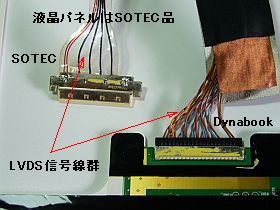 廃棄しようと思っていたSOTEC製ノートの液晶モジュールが、ちょうど同じ大きさだったし、信号線群がLVDSで、線の並び方も似ていたので、置換え可能か?と、試してみました。_左写真_