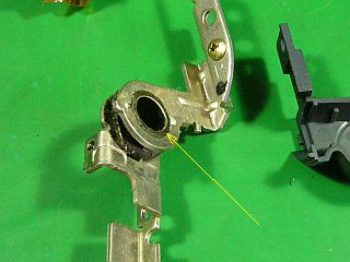 さて、その次がちょっとした“知恵の輪”風の難関なのですが、ヒンジの中を通っているリード線群をコネクタを着けたままで抜き出さなくてはいけません。_左写真<クリック>_