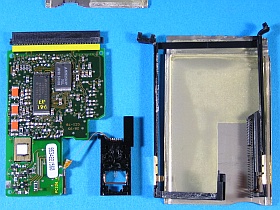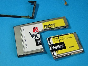 プッシュ−プッシュ式_XJACK型とも言うb^-^;_の薄型モジュラ・ジャックが面白そうだったので、「一言板」で、まく☆彡さんにご無理をお願いして、XJACKコネクタ・タイプのモデム・カードの不良品を頂戴し、これでトライしてみました。_先日来の風邪で大不調だったんですが_