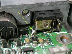 改めて全体をバラし、基板を取り出して、DC電源ジャック部の裏側を見ると、電極端子がランドから完全に浮いた状態になっていて、埃も纏わりついていました。_左写真_