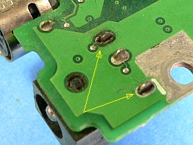 で、修理は、丁寧な掃除と端子磨き_カッターナイフの先で、コリッコリッと_をした後、半田鏝で十分加熱してから糸半田を当て、それが自然に流れ出すようにして半田付け。_左写真<クリック>_