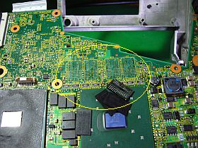 「起動せず」の超軽量型ノートCF-W2ジャンク、不動原因が、メモリ不良/接続不良ではないかと思い、_増設メモリ・モジュールはまだ買ってないものの_ダメ元で基板上のチップを全部外して様子をみました。