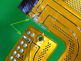 これは上手く行きました_多分?_が、他方、失敗したのは、筐体裏側からの留めビスを無理矢理押し込んだためか、主基板とDVDD基板を繋ぐフレキに孔を空けてしまったこと。_クッソー!_