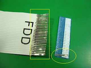 このFFCの定型品には、端部状態の異なる2種があって、金属端子が「同一面になるタイプ」と、「逆面になるタイプ」があるのは知っていましたが、ネット・オークションでは手掛かりは写真だけ。