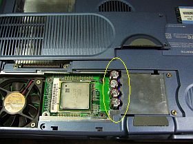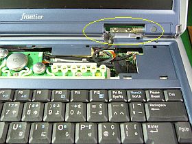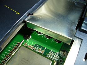 結局、メモリは、_結構外し難い_キーボードの下のアルミ蓋の下にありました。_左写真<クリック> ちゃんと128MBは付いてた_