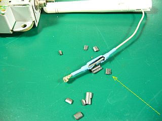 次に、買って来たANTの「フィーダ」には、広域ノイズ抑制用らしき「コア」が被せられていたのだが、台座の孔を通せなかったので、割って取り除いた。_図3_