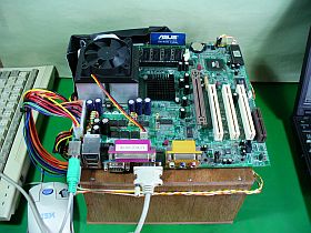 ならば!と一念発起し、板切れを組み合わせて箱を作り、そこへ電源やドライブ類を納め、箱の上にボードを載せるようにしました。_左写真&<クリック>_