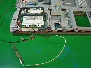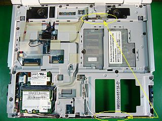 アンテナを外に放り出した状態で、適正ドライバ_Intel(R)PROWireless21_125836.zip_を当てて動作テストをしてみたら、すんなり接続出来ました。_左写真 パームレスト/カバー、キーボードを外して撮影_