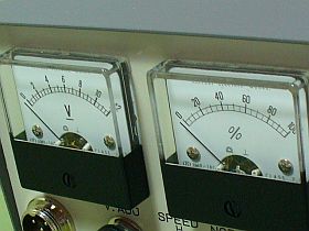 (ネット・オークションで、面白い?ジャンク装置を手に入れた(総費用\1,577)のですが、それの“改造噺”は別途とし、)今回は、その装置に付いていた電圧計%計(!)の目盛/スケール(左写真)を、改造しました。
