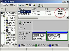 例えば、全容量120GB位だったら、両方FAT32にしておけば、Cドライブに組み込んだWin98から、C,Dドライブ全域が見えます。(左図は、TP600E改でのC,Dドライブ分割の例)