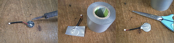 半田付けの後は、幅広ビニール・テープで覆ってカバーの代用にし、周りをハサミで適当に(美しく?)整形します。