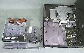 意地悪解説:箱付きスピーカが転がり出さないように、キーボードをあまり上げさせないように制限フックを設けた。これはHDD交換に対する抑止力にもなる。さらに、できるだけHDD交換をやり難くくするように、CDD・FDDやHDDカバーなどで幾重にもガードした。