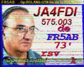 SSTV信号は、アマチュア無線用周波数7.033MHzなどで、受信できます。通信型受信機で受けると、「ピロピロヒョロロ...」と聞こえますが、その信号をSSTV用解読ソフト(今は、主にJE3HHTさん(リンク切れ)のフリー・ソフトMMSSTVを使わせて頂いています)で読ませると、左図のような奇麗な絵が出て来るのです。(所々に横筋が入っているのは、外来雑音や混信のせいです)