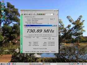 面白い事に、Win98が旧いせいでしょうか、最初はクロック周波数が360MHのままで、“訳分かめ状態”でしたが、SpeedStepを組み込んだら、正常な733MHz?になりました!(左写真)