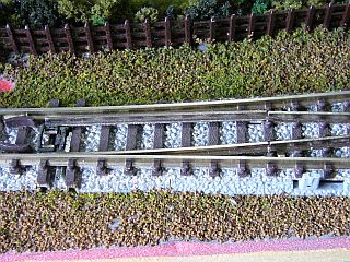 実は、このジオラマ−レイアウトは、ポイント切換部が一箇所あって、それが「手動方式」なのだが、これの動作が面白い。