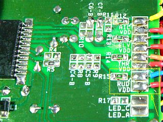 「FMS(Flying Model Simulator)」のヘリで試験飛行をする際に、CH4を「ラダー」に割り当てると、“不安定さ”は“機体の左右回転”だけに制限出来ることが分かったのですが、どうやら、そのCH4=RUD端子が、ヘン!(LSI内部で不良化しているのかな?)(左写真)