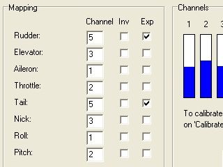 CH1:昇降舵(エレベータ),CH2:補助翼(エルロン),CH3:馬力(スロットル)に割り当て、CH4は不使用にし、無意味なCH5:方向舵(ラダー)としました。(左図)