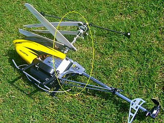 飛ばしていて、垂れ下がっているアンテナ線が、落ちる瞬間にロータ軸に絡み付いてしまうことが幾度もありました。時には、線を引き千切ってしまうことも。(左写真)