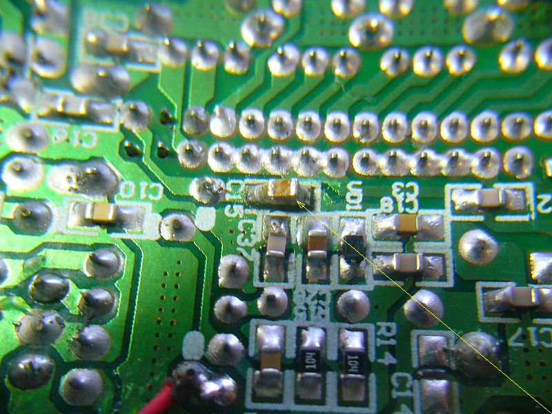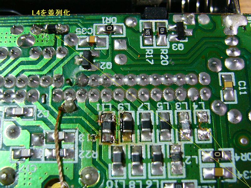 回路図が無いので、"配線パターン"を追うこと位しか出来ないが、付加的にキャパシタ/コンデンサやインダクタ/コイルを半田付けして、様子を見ることは出来た。